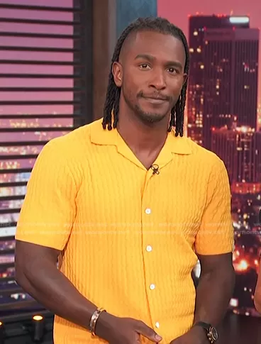 Scott Evans on Access Hollywood on NBC was spotted wearing this orange textured shirt on Access Hollywood on Jun 24 2022's episode. Scott's Shirt is the Avery Short-Sleeved Ribbed Shirt by Rag & Bone.
