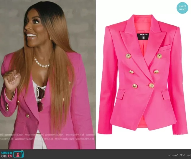 Caroline Brooks (played by Caroline Brooks) on The Real Housewives of Dubai on BravoTV was spotted wearing this pink blazer and pearl sunglasses on The Real Housewives of Dubai on episode 'Desert Detente' (1x04) in Jun 2022. Caroline B's Blazer is the Double Breasted Logo Embossed Blazer by Dolce & Gabbana . Caroline B's Sunglasses is the Pearl Embellished cat eye sunglasses by Dolce & Gabbana . Caroline B's Bag is the Calfskin Sicily Bag with Iguana Print by Dolce & Gabbana.