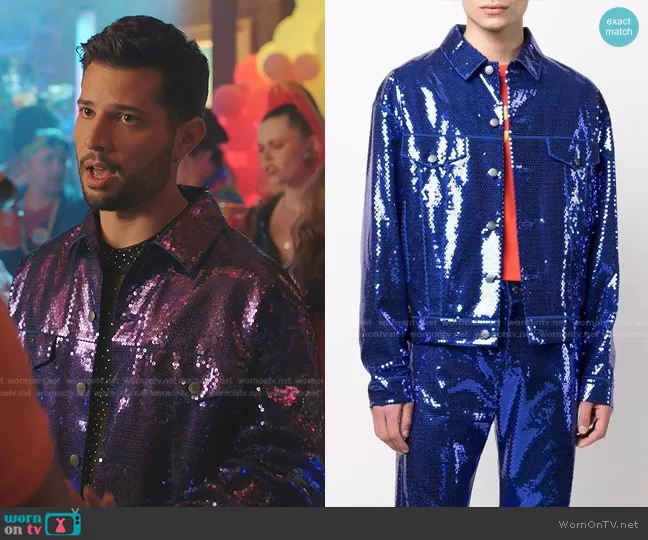 Sam Flores (played by Rafael de la Fuente) on Dynasty on The CW was spotted wearing this sequin jacket and pants on Dynasty on episode 'Ben' (5x15) in Jun 2022. Sam's Jacket is the Sequinned Bomber Jacket by Moschino . Sam's Pants is the Sequinned Straight Leg Trousers by Moschino.
