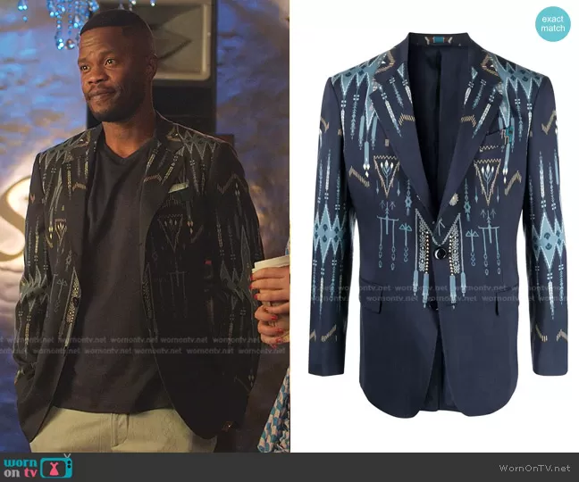 Jeff Colby (played by Sam Adegoke) on Dynasty on The CW was spotted wearing this navy print blazer on Dynasty on episode 'Ben' (5x15) in Jun 2022. Jeff's Jacket is the Printed Slim-Fit Wool-Blend Blazer by Etro.