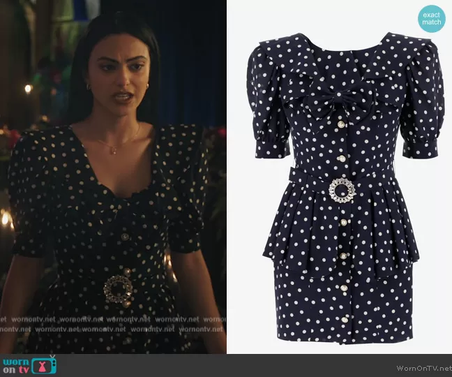 Veronica Lodge (played by Camila Mendes) on Riverdale on The CW was spotted wearing this navy polka dot belted dress on Riverdale on episode 'Chapter One Hundred and Thirteen: Biblical' (6x18) in Jun 2022. Veronica's Dress is the Polka Dot Mini Silk Dress by Alessandra Rich.