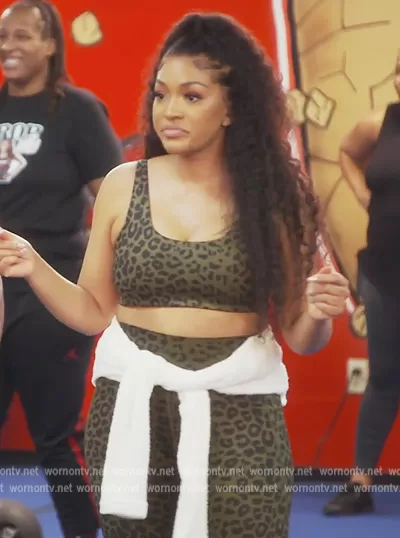 Drew Sidora on The Real Housewives of Atlanta on Bravo was spotted wearing this green leopard print leggings and sports bra on The Real Housewives of Atlanta on episode 'Healthy Glows and Low Blows' (14x08) in Jun 2022. Drew's Top is the Low Impact Power Recycled Scoopneck Sports Bra by Gap . Drew's Leggings is the High Rise Power Compression Recycled 7/8 Leggings by Gap.
