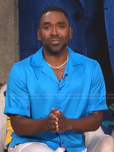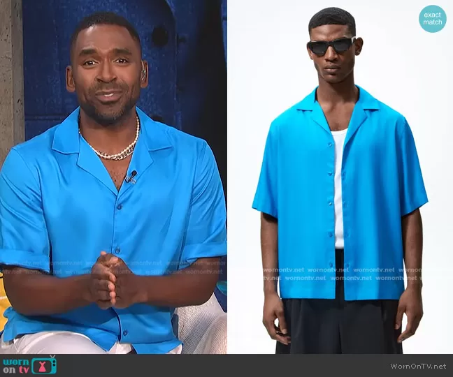 Justin Sylvester on E! News on E! was spotted wearing this blue short sleeve shirt on E! News Daily Pop on Jun 28 2022's episode. Justin's Shirt is the Lyocell Shirt by Zara.