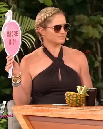 Sara Haines on The View on ABC was spotted wearing this black ring detail halter dress on The View on Jun 28 2022's episode. Sara's Dress is the Kai Low Back Halter Dress by Staud.