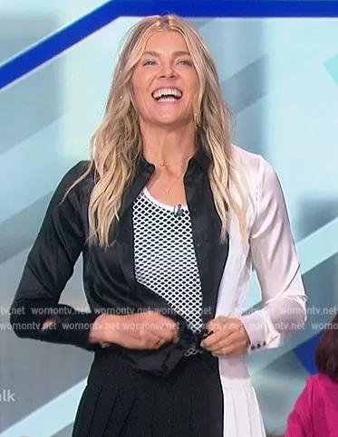 Amanda Kloots on The Talk on CBS was spotted wearing this black colorblock blouse and skirt on The Talk on Jun 28 2022's episode. Amanda's Top is the Willa Colorblock Hidden Placket Stretch Silk Top by Alice + Olivia . Amanda's Skirt is the Wilcox Combo Pleated Skirt by Alice + Olivia.