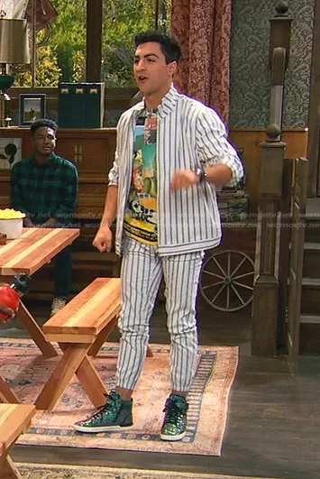 Parker Preston (played by Trevor Tordjman) on Bunkd on Disney was spotted wearing this white striped jacket and pants on Bunkd on episode 'Never a Dull Moo-ment' (6x02) in Jun 2022. Parker's Jacket is the Set Smart Track Jacket in White and Blue Stripe by Asos . Parker's Pants is the Set Slim Smart Sweatpants in White and Blue Stripe by Asos.