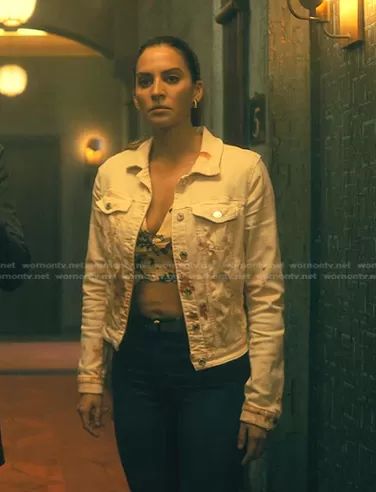 Sloan (played by Genesis Rodriguez) on The Umbrella Academy on Netflix was spotted wearing this Sloan’s yellow floral top and blush pink jacket on The Umbrella Academy on episode 'Oblivion' (3x10) in Jun 2022. Sloan's Top is the Rylan Top by A.L.C. . Sloan's Jacket is the Cropped Denim Jacket by Levi's.