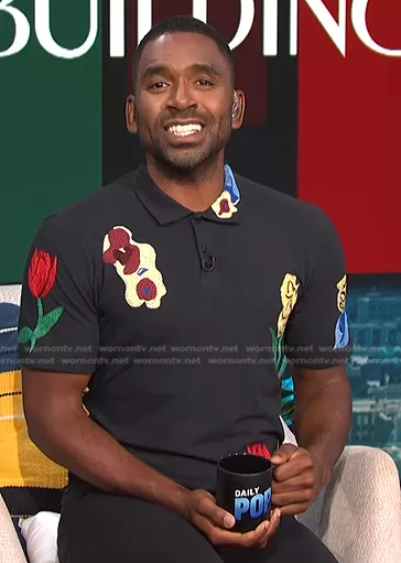 Justin Sylvester on E! News on E! was spotted wearing this black floral embroidered polo shirt on E! News Daily Pop on Jun 29 2022's episode. Justin's Shirt is the Keppel Embroidered Polo Shirt by Ted Baker.