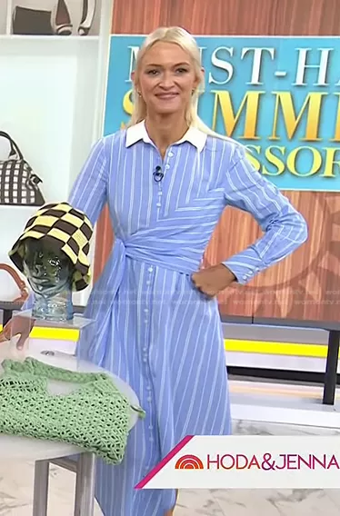 on Today on NBC was spotted wearing this blue striped shirtdress on Today on Jun 29 2022's episode. 's Dress is the Asymmetric Oxford Wrap Dress by Jonathan Simkhai . 's Shoes is the 1461 Quad Platform Derby by Dr. Martens.
