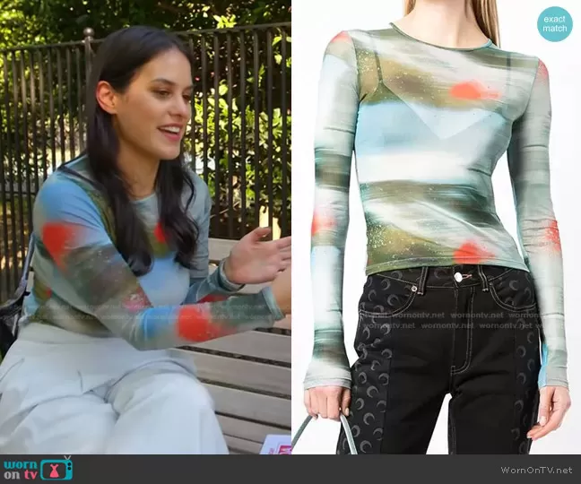 Donna Farizan on Today on NBC was spotted wearing this blue print mesh top on Today on Sep 24 2022's episode. Donna's Top is the Motion Blue Print Long Sleeve Top by Miaou.