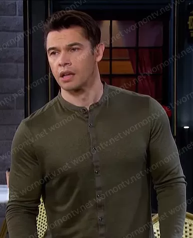 (played by ) on Days of our Lives on Peacock was spotted wearing this green band collar shirt on Days of our Lives on Jul 02 2022's episode. 's Shirt is the Band-Collar Shirt by John Varvatos.