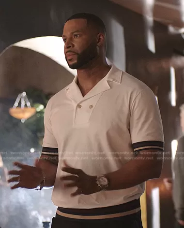 (played by ) on Dynasty on The CW was spotted wearing this Michael’s white striped trim polo shirt on Dynasty on episode 'My Family, My Blood' (5x16) in Jul 2022. 's Shirt is the Short-Sleeved Organic-Cotton Polo Shirt by Giorgio Armani.