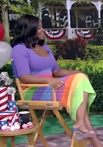 on Live with Kelly and Mark on Disney ABC Home Entertainment was spotted wearing this rainbow striped dress on Live with Kelly and Ryan on Jul 04 2022's episode. 's Dress is the Striped Colorblock Midi-Dress by Christopher John Rogers.