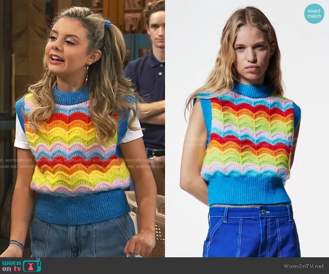 Destiny Baker (played by Mallory James Mahoney) on Bunkd on Disney was spotted wearing this rainbow scalloped vest on Bunkd on episode 'Wrecks Mark the Spot' (6x04) in Jul 2022. Destiny's Sweater is the Wavy Knit Vest by Zara . Destiny's Shoes is the Leopard High Top Shoes by Converse.