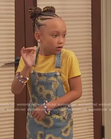 Alice Baxter (played by Mykal-Michelle Harris) on Ravens Home on Disney was spotted wearing this daisy print denim overalls on Ravens Home on episode 'To Halve & Halve Not' (5x14) in Jul 2022. Alice's Overalls is the Daisy All Over Print Shortall by Epic Threads.