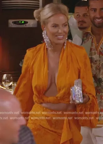 Caroline Stanbury (played by Caroline Stanbury) on The Real Housewives of Dubai on BravoTV was spotted wearing this orange twist blouse and skirt on The Real Housewives of Dubai on episode 'Piping Tea with a Hint of Peach' (1x05) in Jul 2022. Caroline's Top is the Twist Front Cut out Satin Jacquard Top by Attico . Caroline's Skirt is the Gia floral jacquard skirt by Attico.