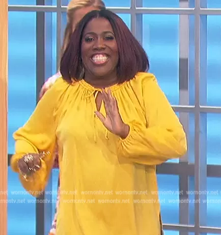 Sheryl Underwood on The Talk on CBS was spotted wearing this yellow tie neck blouse on The Talk on Jul 07 2022's episode. Sheryl's Top is the Caprice Blouse by Kobi Halperin.