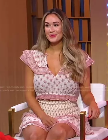 on Good Morning America on ABC was spotted wearing this white floral ruffle top and mini skirt on Good Morning America on Jul 07 2022's episode. 's Set is the Jolisa Set by Saylor.
