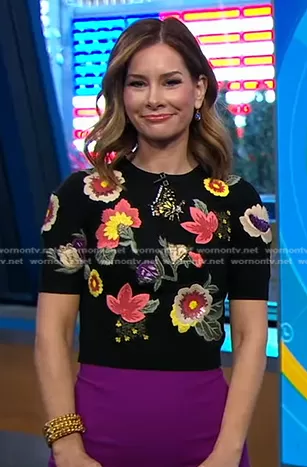 Rebecca Jarvis on Good Morning America on ABC was spotted wearing this black floral embroidered sweater on Good Morning America on Oct 29 2025's episode. Rebecca's Sweater is the Ciara Embroidered Sweater by Alice + Olivia.