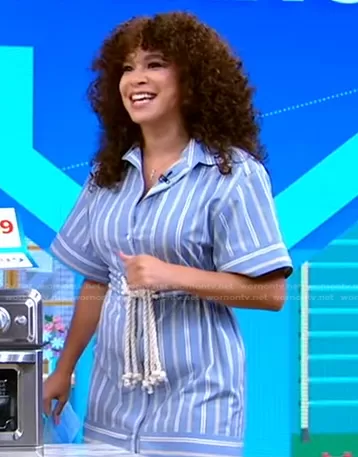 on Good Morning America on ABC was spotted wearing this blue striped dress on Good Morning America on Jul 11 2022's episode. 's Dress is the Fiona Stripe Rope Tie Cotton Tunic Shirt by AKNVAS.