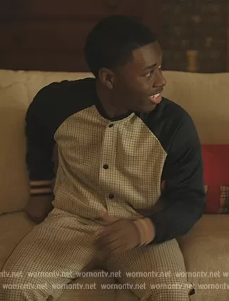 (played by ) on The Chi on ShowTime was spotted wearing this Contrast check bomber jacket on The Chi on episode 'This Christmas' (5x03) in Jul 2022. 's Jacket is the Contrast Check Jacket by Zara . 's Pants is the Matching Stripe Jogger Pants by Zara.