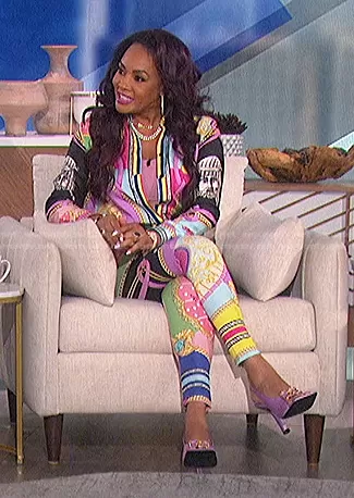 on The Talk on CBS was spotted wearing this multicolor print blouse and leggings on The Talk on Jul 11 2022's episode. 's Top is the Barocco Print Formal Shirt by Versace . 's Leggings is the Barocco Print Leggings by Versace . 's Belt is the Reversible VLogo Leather Belt by Valentino Garavani . 's Shoes is the Frame Slingback Sandal in Liatris-Versace Gold by Versace.