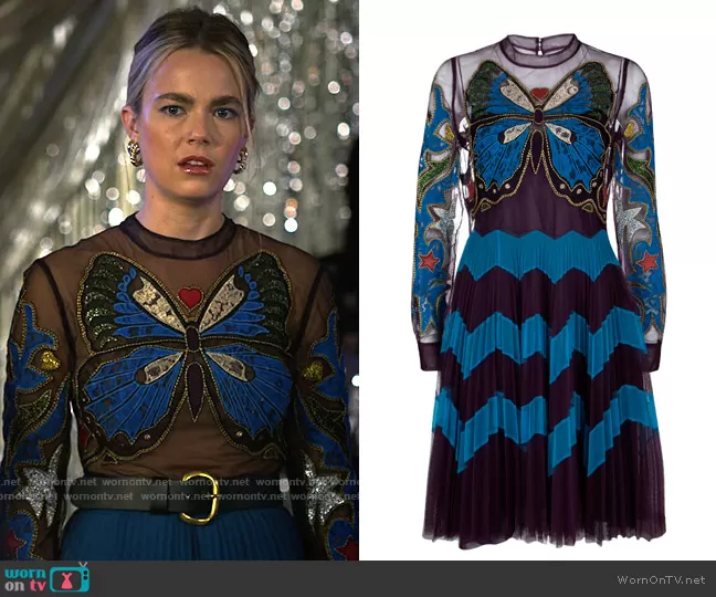 Maggie (played by Rebecca Rittenhouse) on Maggie on Hulu was spotted wearing this butterfly dress at the prom on Maggie on episode 'Your Past Will Inform Your Present' (1x08) in Jul 2022. Maggie's Dress is the Butterfly Embroidered Dress by Mary Katrantzou . Maggie's Belt is the Estate Belt by Rachel Comey . Maggie's Bag is the Charlie Chain Crossbody in Cherry Red by Free People.