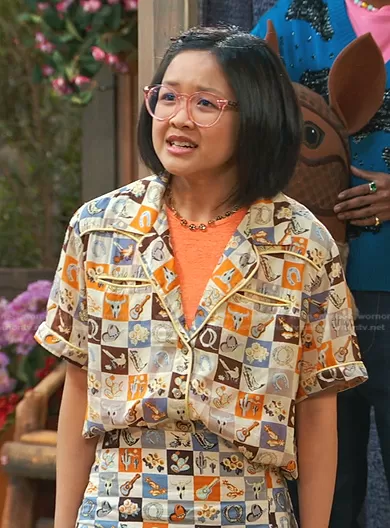 (played by ) on Bunkd on Disney was spotted wearing this western print shirt and mini skirt on Bunkd on episode 'The Truth Will Sweat You Free' (6x05) in Jul 2022. 's Top is the Freddie Souvenir Button-Down Top by Urban Outfitters . 's Skirt is the Paradise Printed Notched Mini Skirt In Brown Multi by Urban Outfitters.