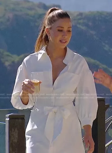 Gabriela Windey on The Bachelorette on ABC was spotted wearing this white tie waist shirtdress on The Bachelorette on episode 'Week 1' (19x01) in Jul 2022. Gabby's Dress is the Stacey Mini Shirt Dress by Cinq a Sept.