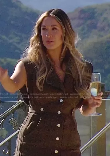 Rachel Recchia on The Bachelorette on ABC was spotted wearing this brown button down mini dress on The Bachelorette on episode 'Week 1' (19x01) in Jul 2022. Rachel's Dress is the Walter Sleeveless Cotton-Linen Mini Dress by Acler.