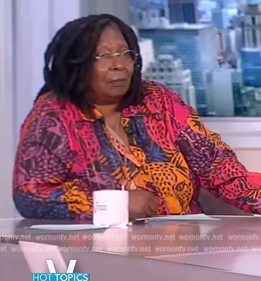 Whoopi Goldberg on The View on ABC was spotted wearing this rainbow animal print shirt on The View on Jul 12 2022's episode. Whoopi's Top is the Rainbow Midnight Leopards Pajama Shirt by Farm Rio.