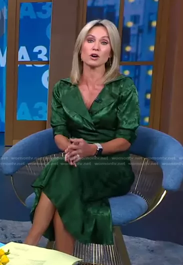 Amy Robach on Good Morning America on ABC was spotted wearing this green wrap dress on Good Morning America on Jul 12 2022's episode. Amy's Dress is the Carol Collared Faux Wrap Maxi Dress by Ronny Kobo . Amy's Earrings is the Kathryn Front to Back Earrings by Bonheur Jewelry.