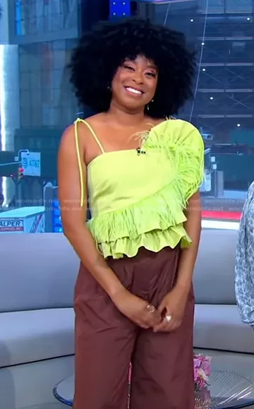 on Good Morning America on ABC was spotted wearing this yellow ruffled feather trim top and brown pants on Good Morning America on Jul 12 2022's episode. 's Top is the Claudette Top by Tanya Taylor . 's Pants is the Kenia Pleated Wide Leg Pants by Tanya Taylor.