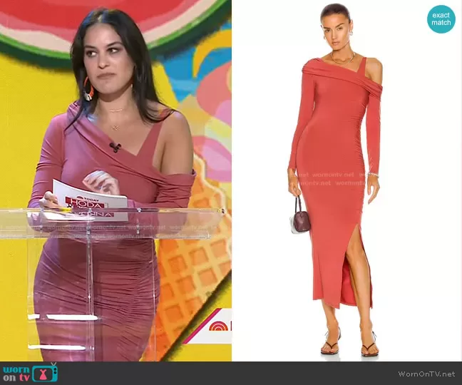 Donna Farizan on Today on NBC was spotted wearing this pink asymmetric dress on Today on Jul 15 2022's episode. Donna's Dress is the Samantha Midi Dress by Jonathan Simkhai.