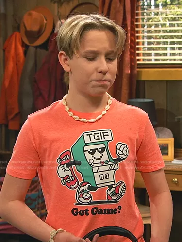 Jake (played by Luke Busey) on Bunkd on Disney was spotted wearing this orange TGIF Got Game print tee on Bunkd on episode 'The Truth Will Sweat You Free' (6x05) in Jul 2022. Jake's Shirt is the Boys Crew-Neck Graphic T-Shirt by Old Navy.