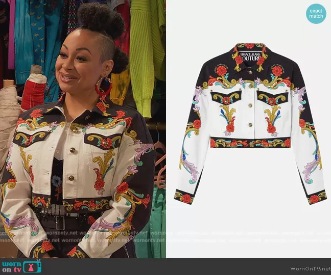 Raven Baxter (played by Raven-Symoné) on Ravens Home on Disney was spotted wearing this white printed denim jacket on Ravens Home on episode 'The Fierce Awakens' (5x15) in Jul 2022. Raven's Jacket is the Sun Flower Garland Denim Jacket by Versace.