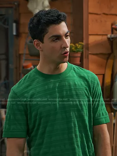 Parker Preston (played by Trevor Tordjman) on Bunkd on Disney was spotted wearing this green striped tee on Bunkd on episode 'The Truth Will Sweat You Free' (6x05) in Jul 2022. Parker's Top is the Nekache striped cotton-blend T-shirt by Ted Baker.