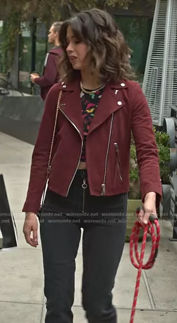 Louise (played by Nichole Sakura) on Maggie on Hulu was spotted wearing this butterfly print top and red suede jacket on Maggie on episode 'The Fortune You Seek Is In Another Cookie' (1x12) in Jul 2022. Louise's Top is the Delaina Butterfly Crop Top by Alice + Olivia . Louise's Jacket is the Dalby Suede Biker Jacket by All Saints . Louise's Jeans is the Peyton Jeans by Reformation . Louise's Bag is the Ybeaswen Bag by Aldo.