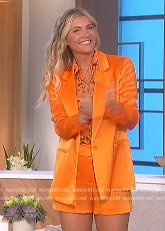 Amanda Kloots on The Talk on CBS was spotted wearing this orange horse print blouse and blazer on The Talk on Jul 14 2022's episode. Amanda's Top is the Martell horse-print silk blouse by Alice + Olivia . Amanda's Blazer is the Denny Blazer by Alice + Olivia . Amanda's Shorts is the Mara crossover waistband shorts by Alice + Olivia.