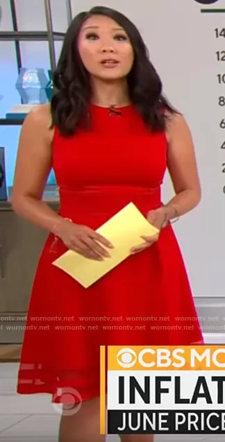 Nancy Chen on CBS Mornings on CBS was spotted wearing this red mesh striped dress on CBS Mornings on Jul 14 2022's episode. Nancy's Dress is the Illusion-Trim Fit & Flare Dress by Calvin Klein .