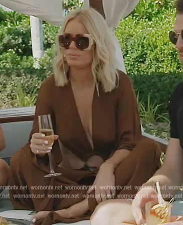 Caroline Stanbury (played by Caroline Stanbury) on The Real Housewives of Dubai on BravoTV was spotted wearing this brown ring detail maxi dress on The Real Housewives of Dubai on episode 'Dinner on the Rocks' (1x06) in Jul 2022. Caroline's Dress is the Jasmin Cutout Gown by Cult Gaia . Caroline's Sunglasses is the Chain-trimmed square sunglasses by Gucci.