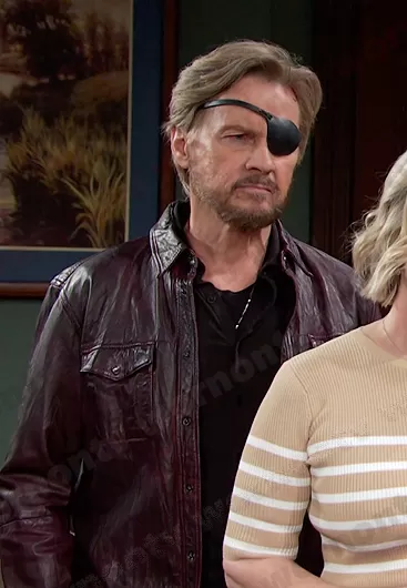 Steve (played by Stephen Nichol) on Days of our Lives on Peacock was spotted wearing this burgundy leather jacket on Days of our Lives on May 13 2025's episode. 's Jacket is the Lionell Leather Shirt Jacket by John Varvatos Star USA.
