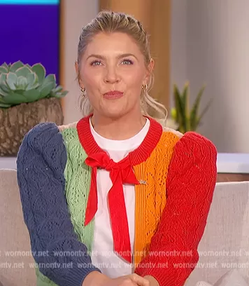 Amanda Kloots on The Talk on CBS was spotted wearing this colorblock tie neck cardigan on The Talk on Jul 15 2022's episode. Amanda's Sweater is the Colorblock Open Stitch Tie Neck Cardigan by Alice + Olivia.