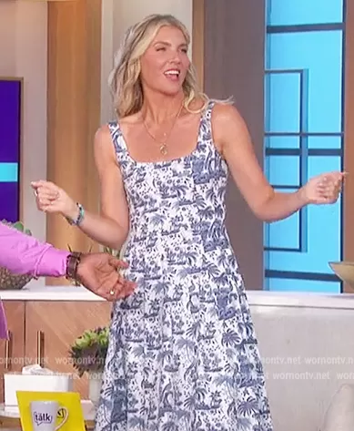 Amanda Kloots on The Talk on CBS was spotted wearing this blue floral sleeveless dress on The Talk on Jul 15 2022's episode. Amanda's Dress is the Wells Dress by Staud.