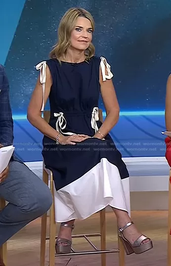 Savannah Guthrie on Today on NBC was spotted wearing this navy colorblock tie bow detail dress on Today on May 30 2023's episode. Savannah's Dress is the Genoa Midlength Drawstring Dress by G.Label.
