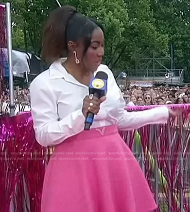 on Good Morning America on ABC was spotted wearing this pink tweed mini skirt on Good Morning America on Jul 15 2022's episode. 's Skirt is the Embellished Wool-Blend Tweed Mini Skirt by Valentino.