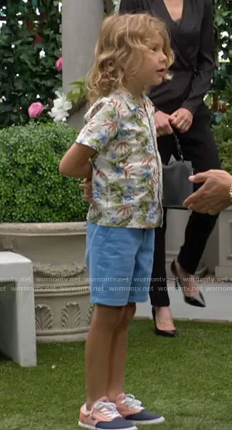 (played by ) on The Young and the Restless on CBS was spotted wearing this floral shirt and blue shorts on The Young and the Restless on Jul 15 2022's episode. 's Shirt is the Floral Button-Front Camp Shirt by Janie and Jack . 's Shorts is the The Everywhere Quick Dry Shorts by Janie and Jack . 's Shoes is the Jump Serve Lace Canvas Sneakers by Lacoste.