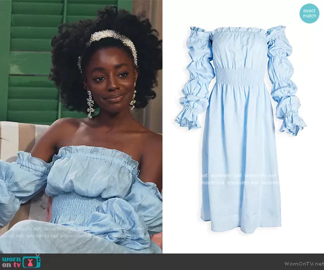 Venita Aspen on Southern Charm on Bravo TV was spotted wearing this blue ruffle sleeve linen dress on Southern Charm on episode 'It's My Party and I'll Fight if I Want To' (8x04) in Jul 2022. Venita's Dress is the Michelin Linen Dress by Sleeper.