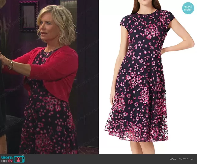 Kayla Brady (played by Mary Beth Evans) on Days of our Lives on Peacock was spotted wearing this navy and pink floral embroidered dress on Days of our Lives: Beyond Salem on Jul 16 2022's episode. Kayla's Dress is the Tia Embroidered Fit & Flare Dress by Hobbs London.