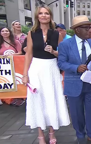 Savannah Guthrie on Today on NBC was spotted wearing this black half-zip top and white textured skirt on Today on Oct 17 2022's episode. Savannah's Top is the Sleeveless Front Zip Polo Shirt by Akris Punto . Savannah's Skirt is the Embroidered Eyelet Midi-Skirt by Lela Rose . Savannah's Shoes is the Baby Buckle Horsebit Ankle-Strap Sandals by Gucci.